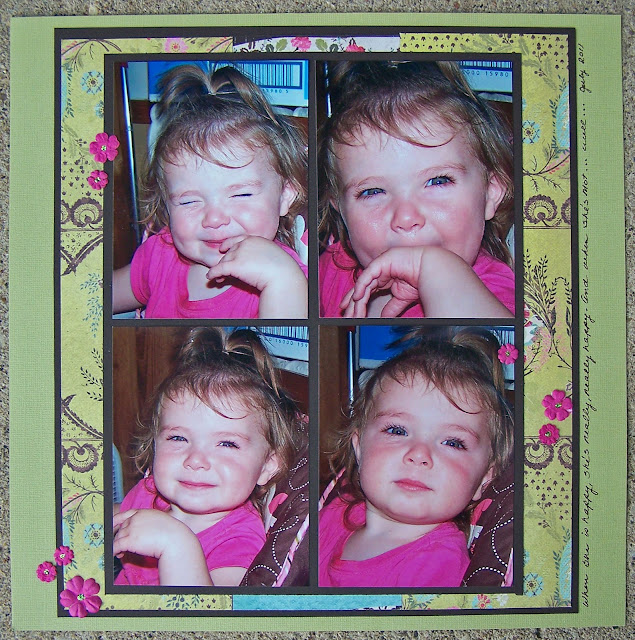 I used papers and flowers from Prima, cardstock from Bazzill and pulled out my Cricut to cut the title and the swirls. It's called "Get Happy" cuz when I look at our little Miss Izzie in these photos, that old song, "Come on, Get Happy" started playing in my head.... (y-e-a-h, I can see what you're thinking, she has issues---she let the paper go where she thinks it wants to and the photos sing to her--ok, maybe a little less caffeine is in order...)